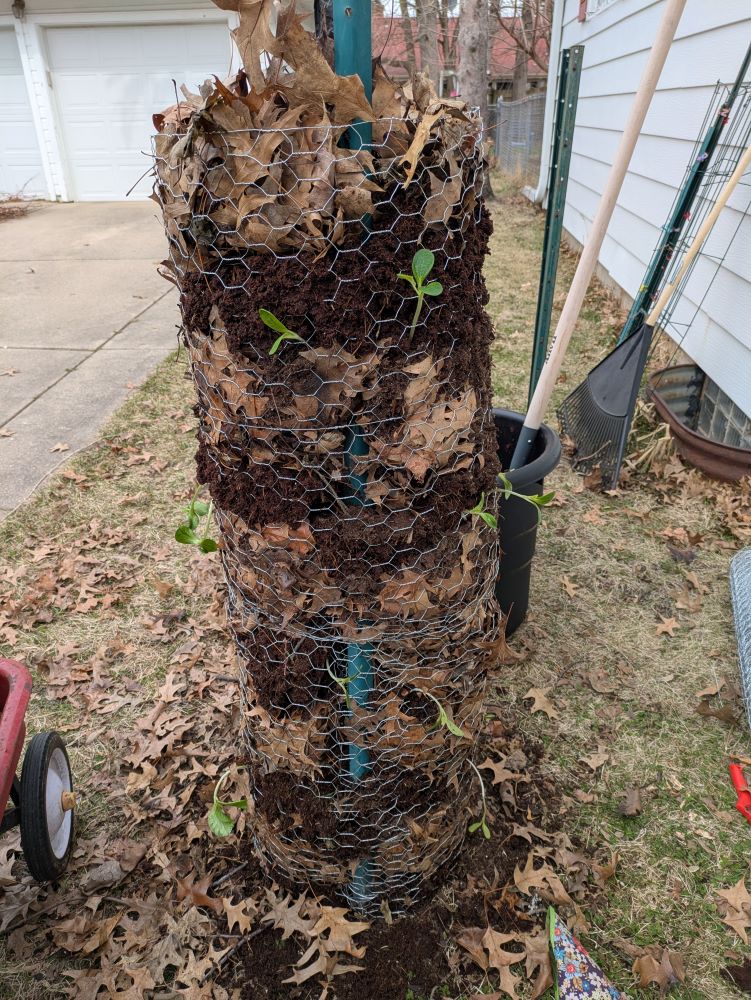 When I reached the second tower, I added more chicken wire, weaving it onto the first with more of the wire. I ended up with about 4 layers, topped with coir and leaves. I also tied the wire to the posts as best as I could. The topping piece was a funnel with a sink strainer in, both of which I picked up from the dollar store, to help get water into the irrigation pipe. Hopefully it grows well; it’s been almost a week and they haven’t wilted yet!* I have 2 towers of squash and am planning to put 2 more towers together to add some bare-root strawberries into later.